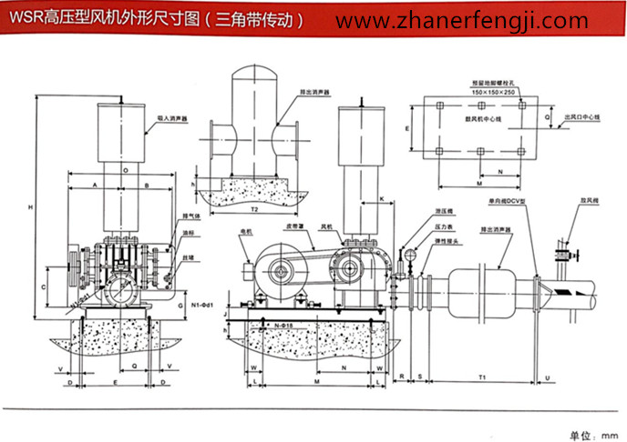 高壓型羅茨鼓風(fēng)機(jī) 高壓羅茨鼓風(fēng)機(jī)是羅茨風(fēng)機(jī)中的其中一種。主要服務(wù)于污水處理廠、發(fā)電廠、煤礦化工廠、水泥、冶金、粉塵或顆粒、印染廠等大型工廠、水產(chǎn)養(yǎng)殖等眾多領(lǐng)域。接下來一起看看高壓型羅茨鼓風(fēng)機(jī)外形尺寸圖(三角帶型):
